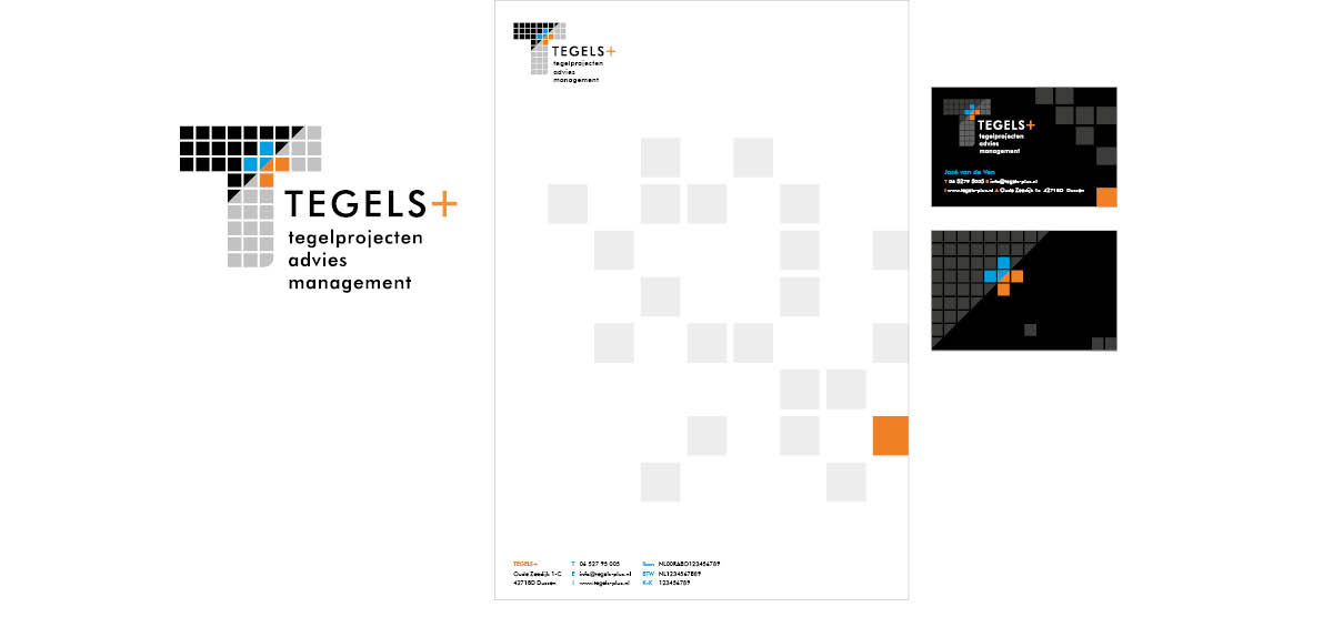 Tegels+ huisstijl ontwerp Voor Tegels+ ontwierpen we een strakke, professionele huisstijl met een creatieve touch. Hilda Moolhuizen Huisstijl Orthowest