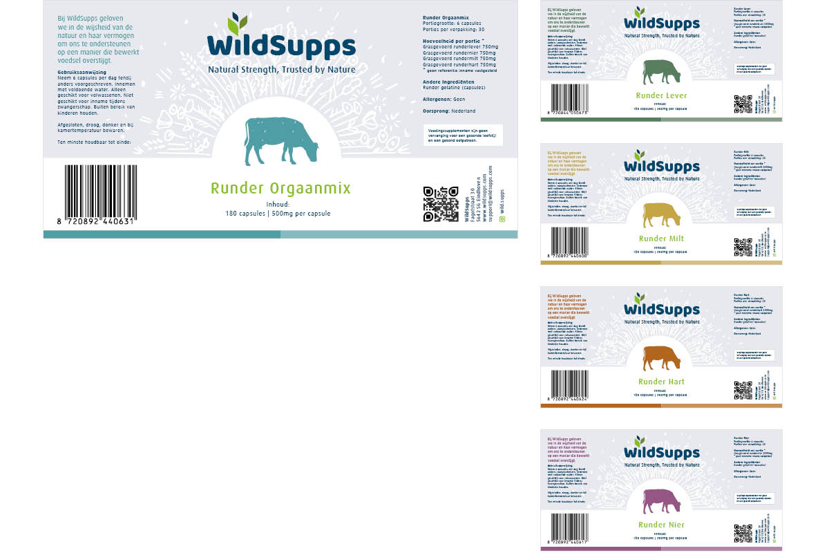 Ontwerp etiketten voor supplementenlijn In opdracht van Wildsupps ontwierp Conk etiketten voor deze nieuwe lijn supplementen. Kaasetiketten Ontwerp doosje Sun Defense
